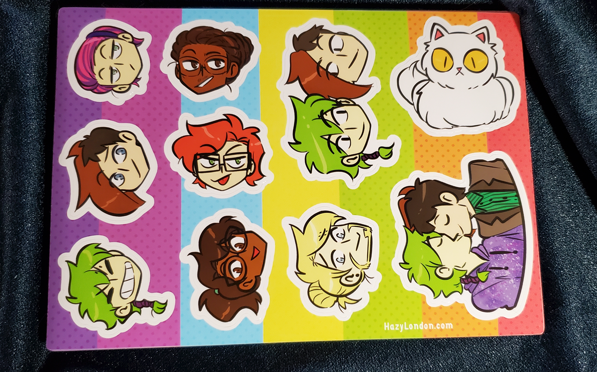 A fun little sticker sheet featuring the main cast from my webcomic Hazy London! This die-cut sticker sheet measures 6"x8".